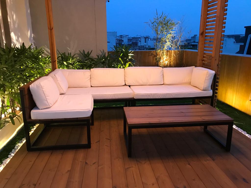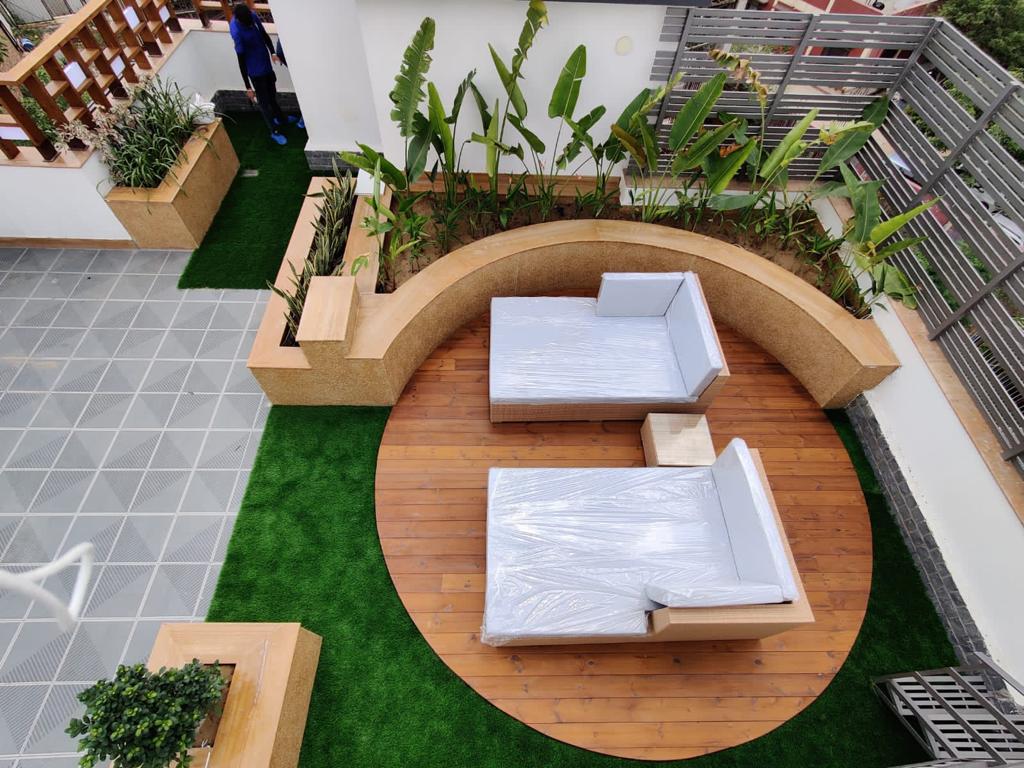 Modular outdoor seating and wooden deck lounges offer comfort and style — perfect for evening relaxation or hosting under the stars.