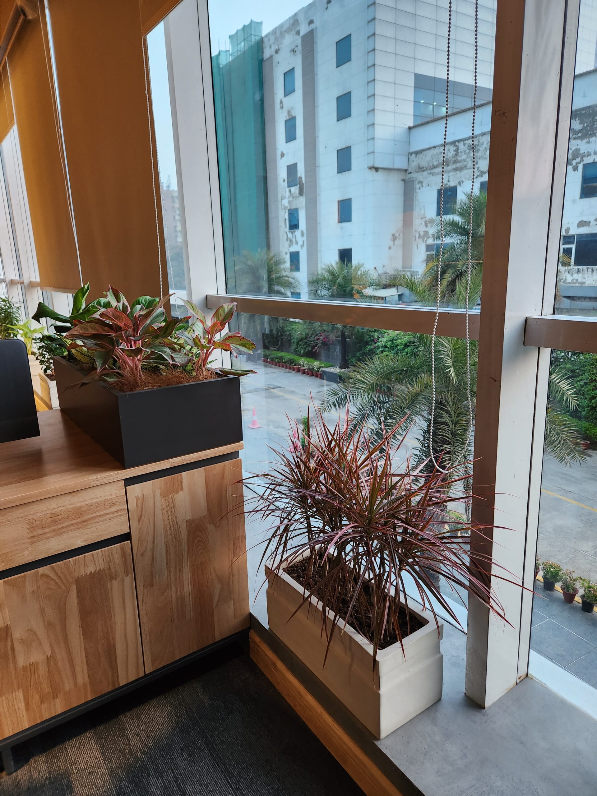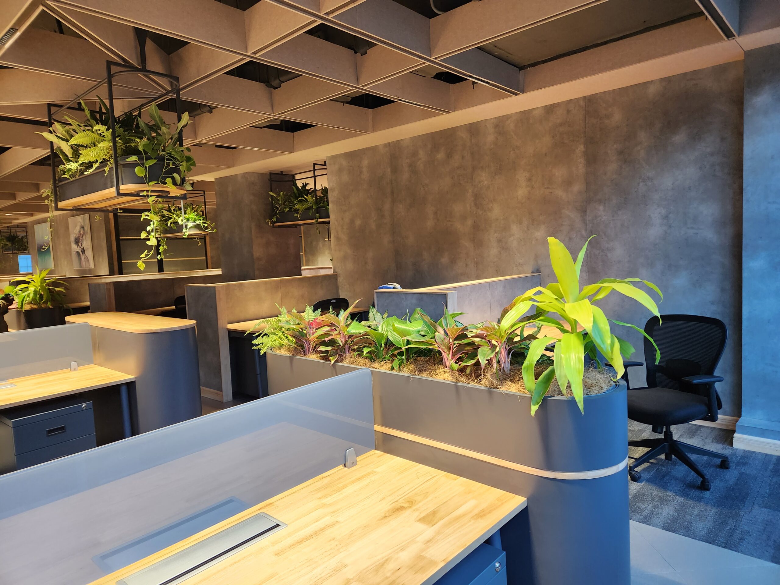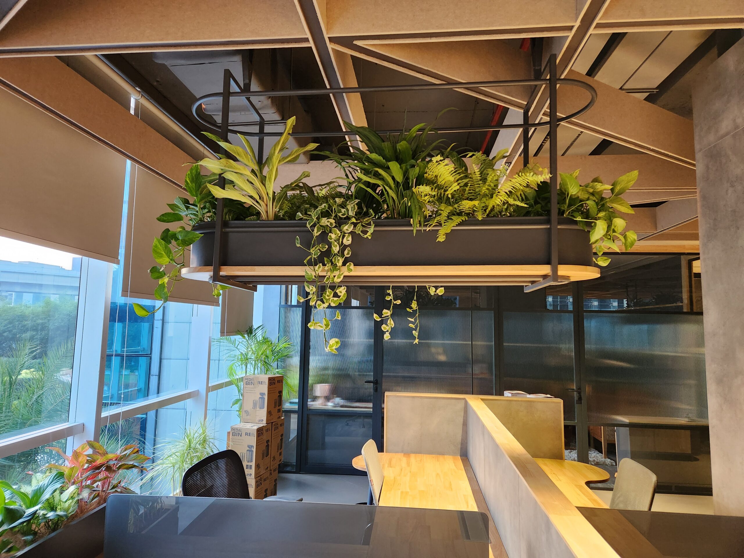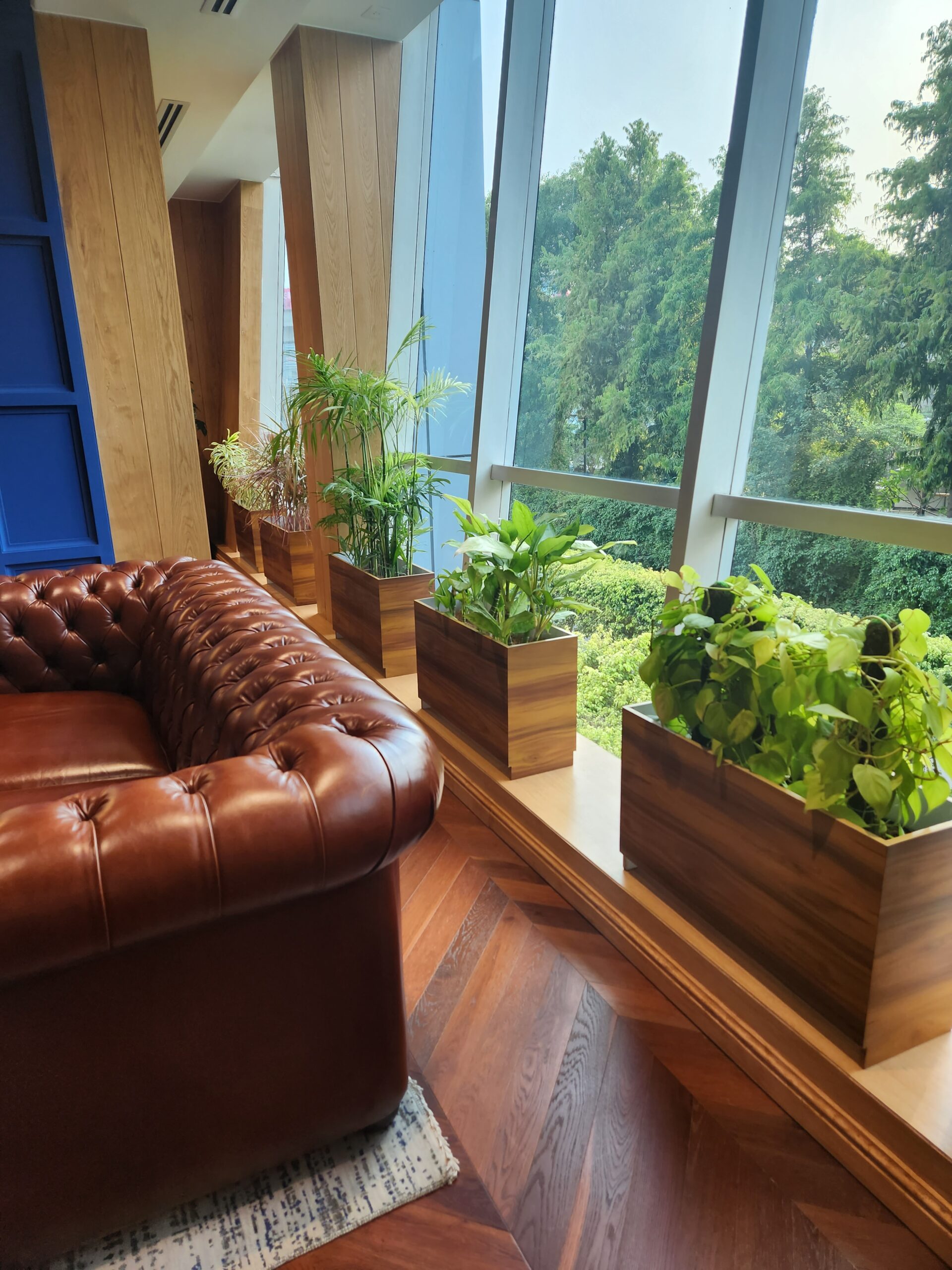 Sleek ceramic, metal, and wooden planters complement the office’s contemporary interiors, adding natural warmth to reception zones, workstations, and breakout areas.