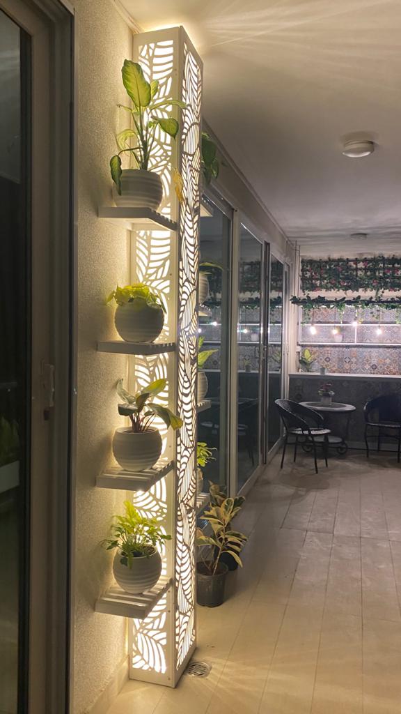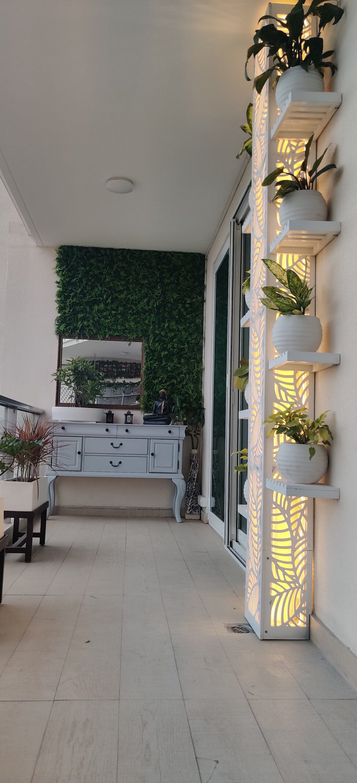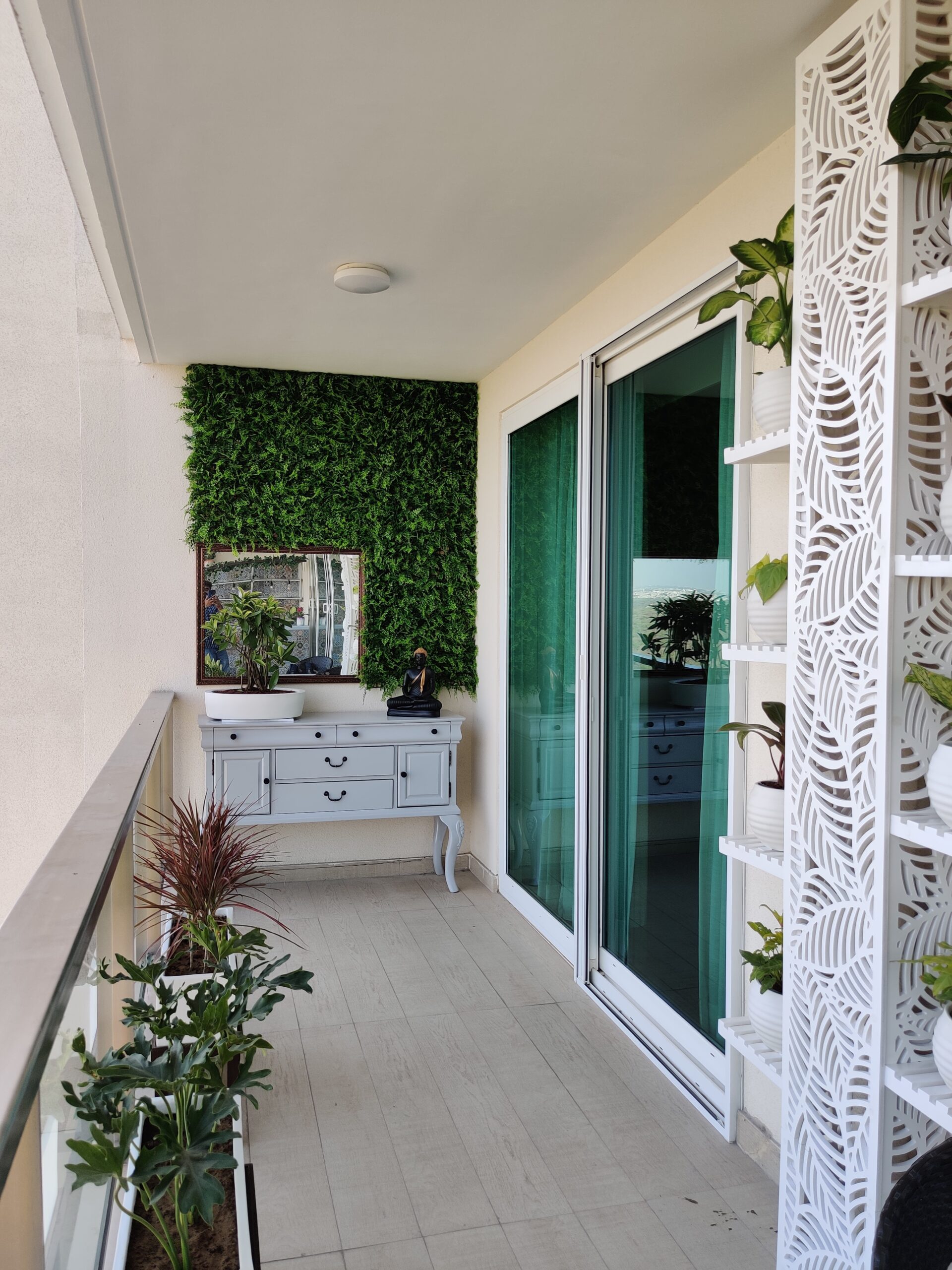 Turn your balcony into a stylish retreat that blends comfort, greenery, and serenity. This balcony design with a custom bar counter, lush planters, and a calming Buddha console transforms even a compact space into a personal sanctuary.