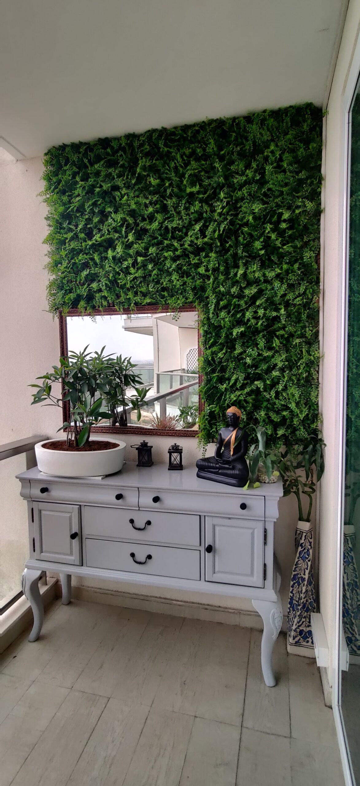 A mix of tall bamboo, hanging pots, and herb planters for layered greenery.Vertical garden options to maximize limited space.Self-watering systems for low maintenance.