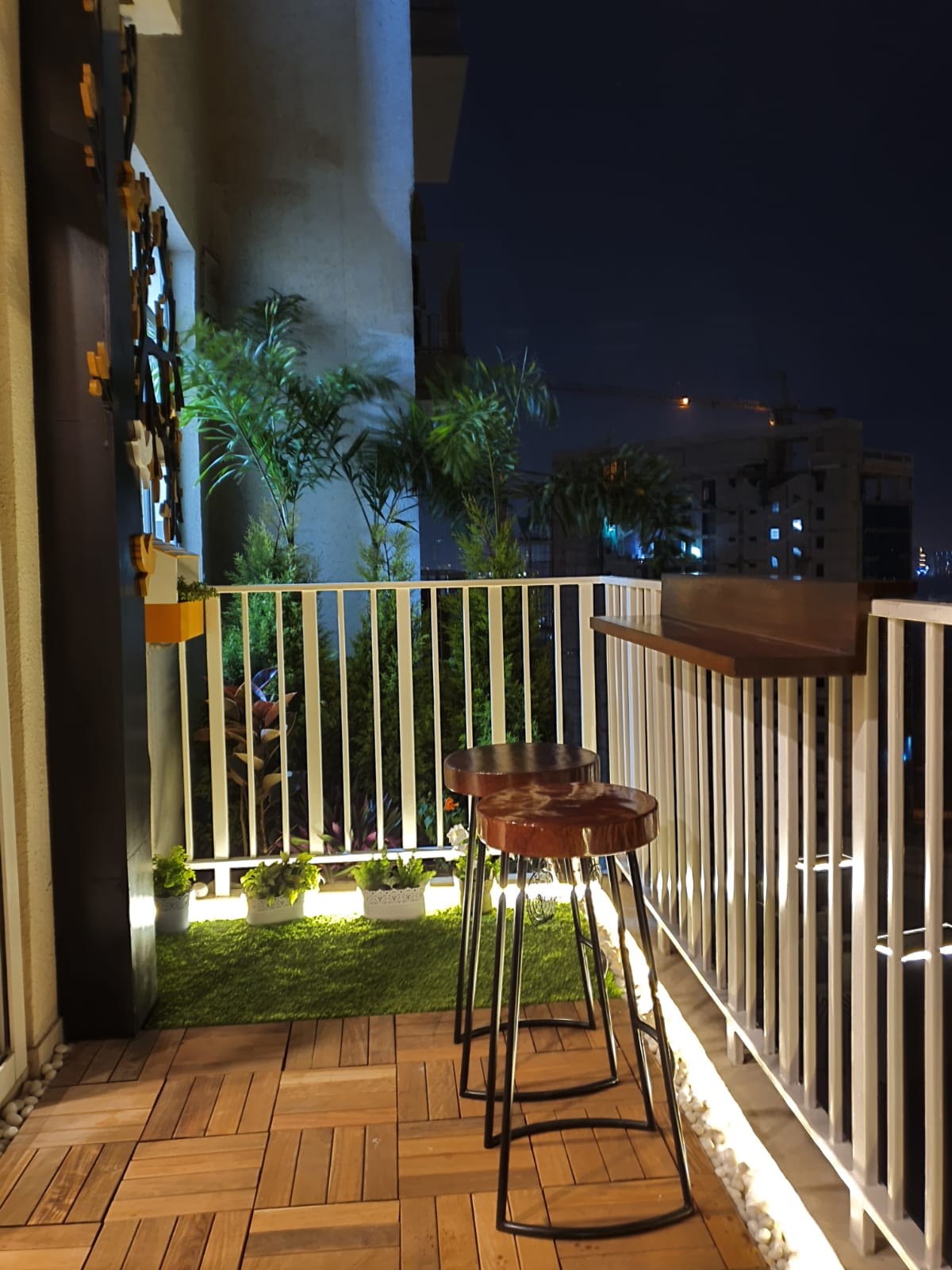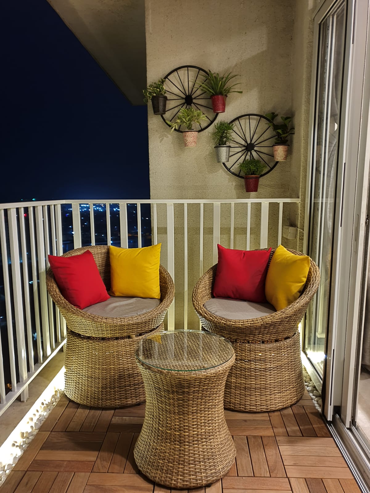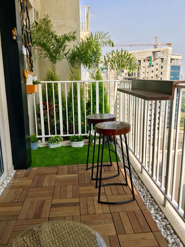 Modern Balcony With Wicker Funiture And Wooden Tiles