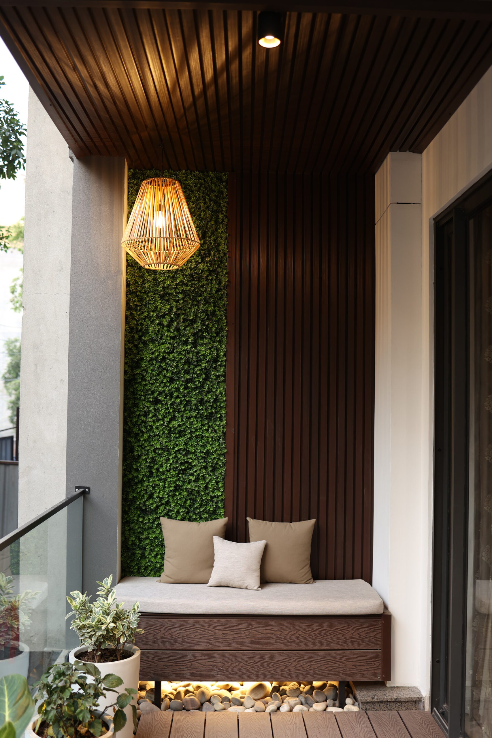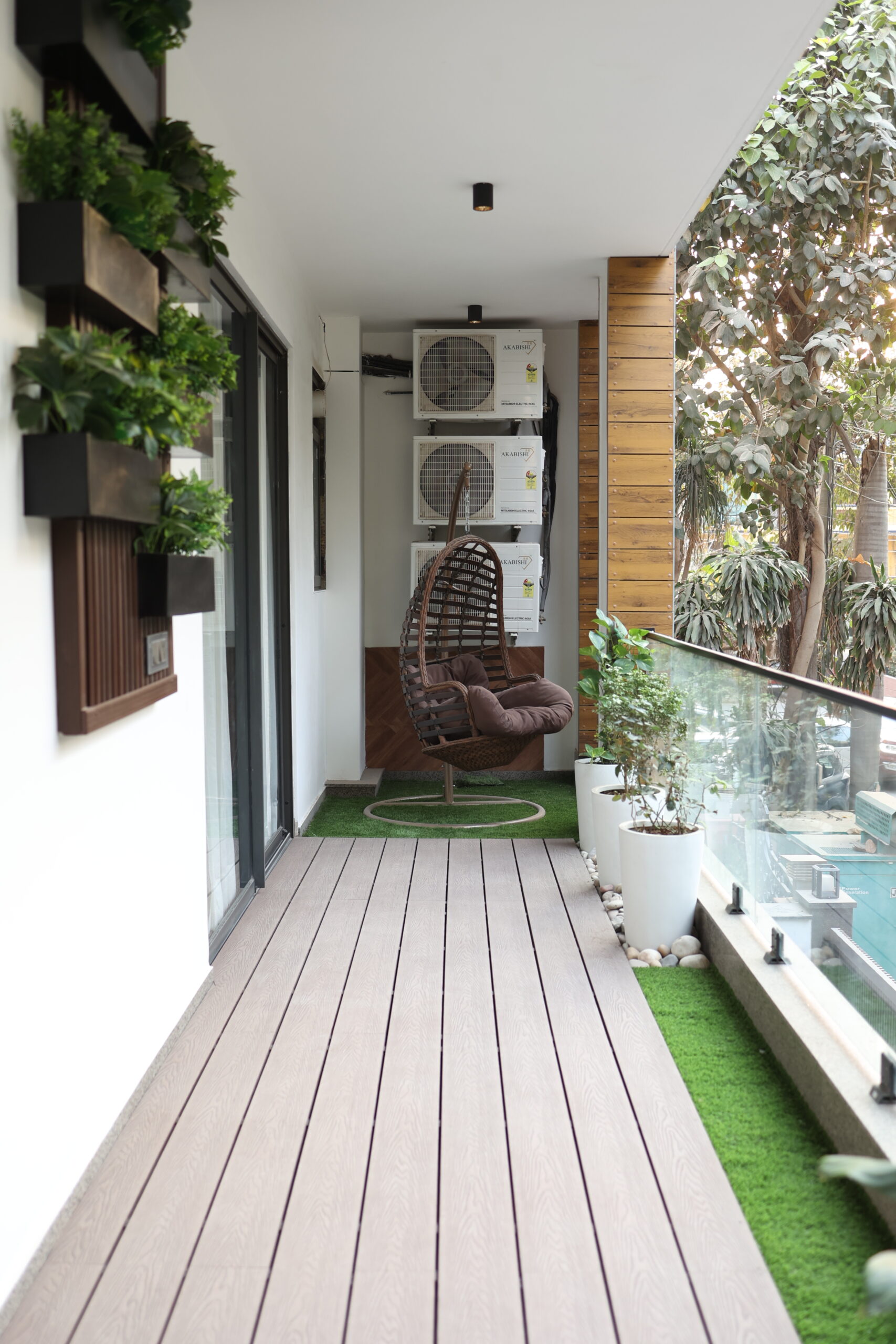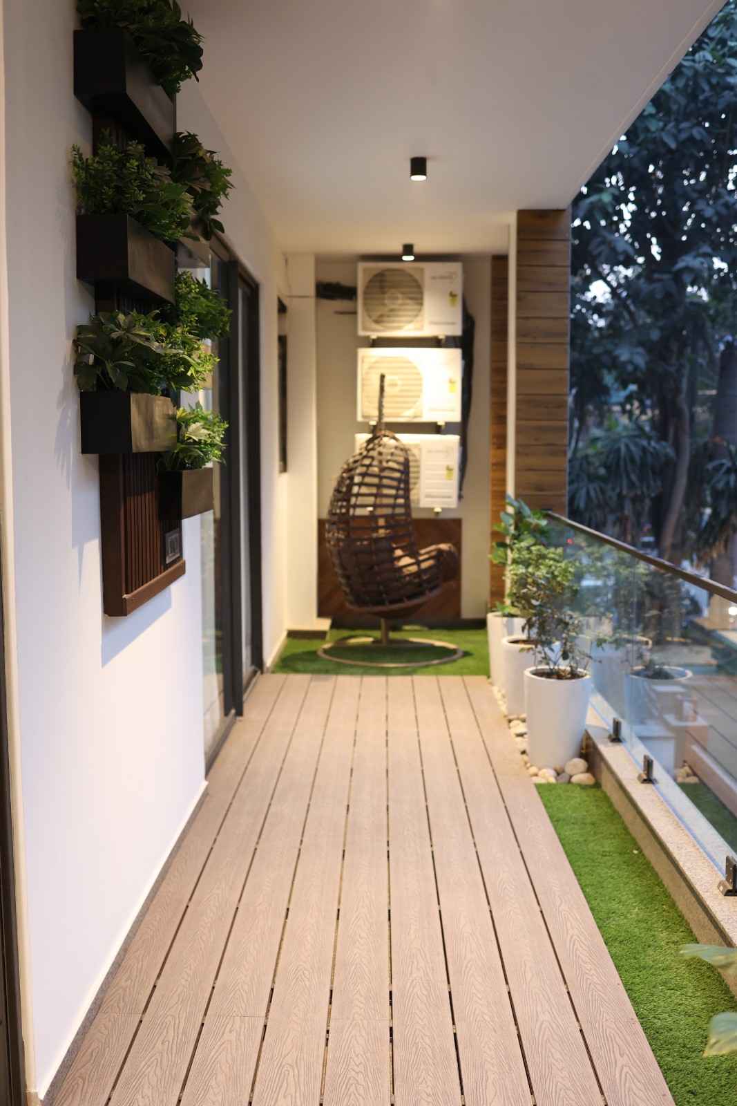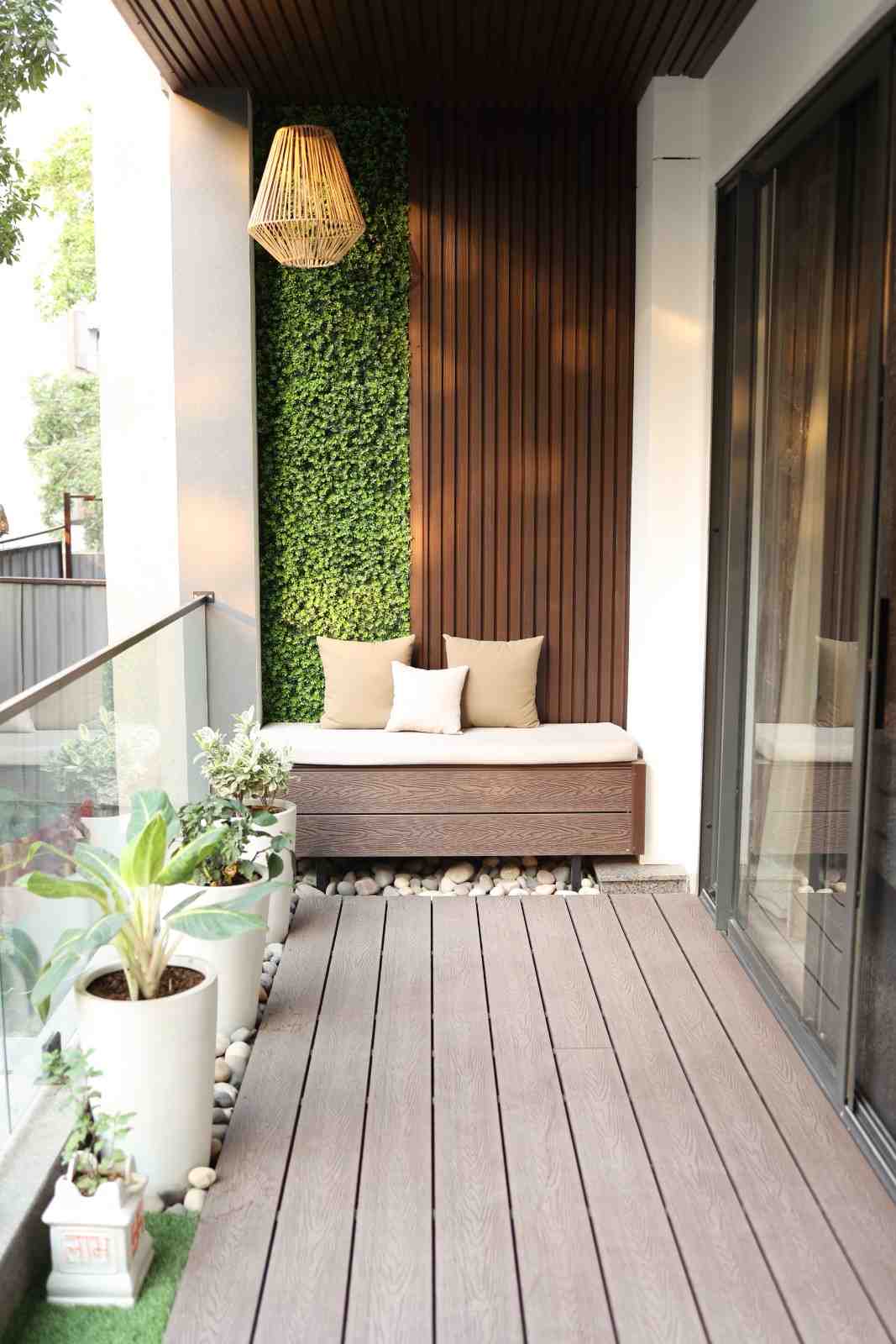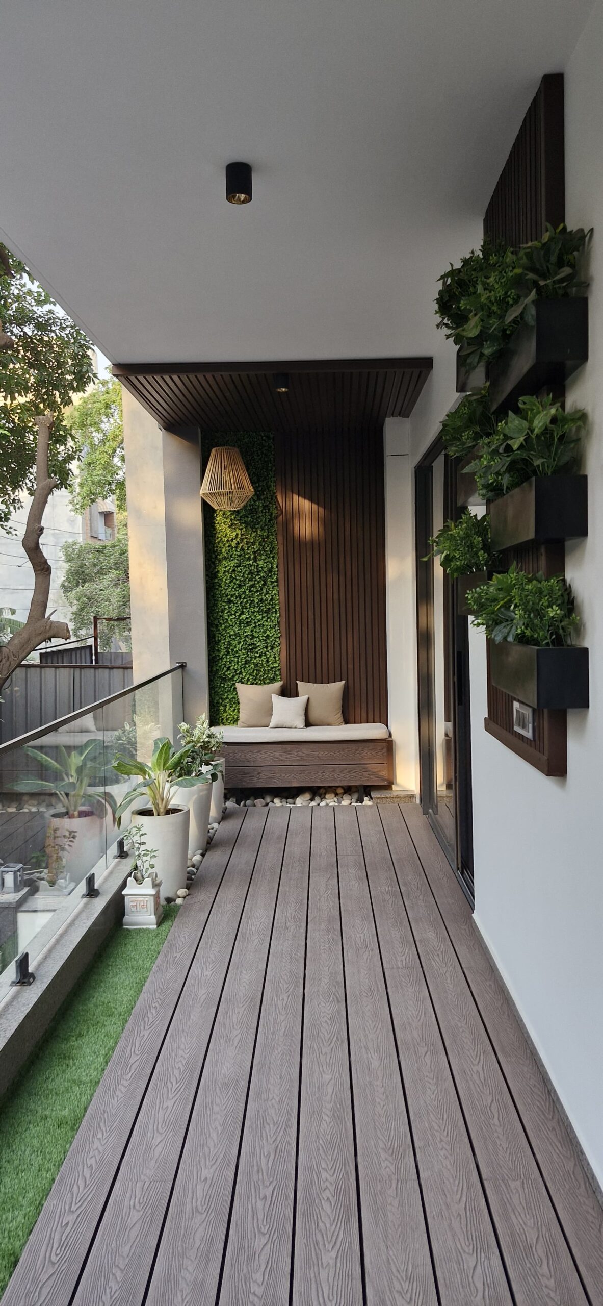 • Special Features – Feature wall with bench, wpc leuvers on ceiling, wall mount, wpc decking, grass and plants