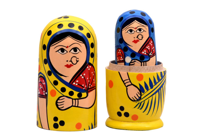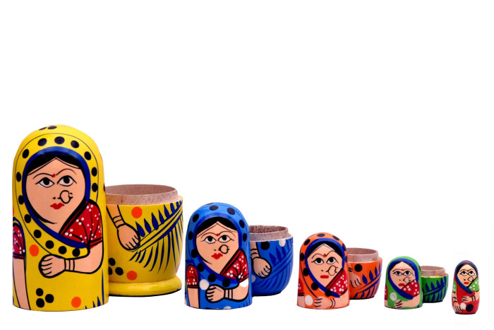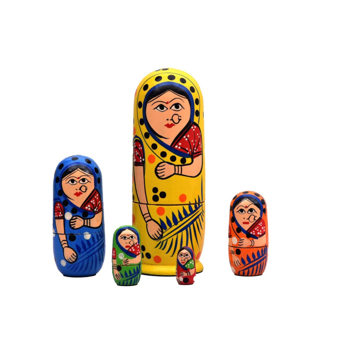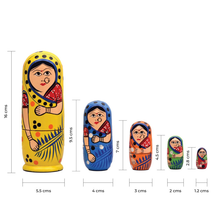 Celebrate artistry and tradition with this set of 5 hand-painted Russian Nesting Dolls. Each doll fits perfectly inside the next, featuring intricate artwork of Indian ladies draped in elegant sarees, combining cultural charm with collectible appeal.