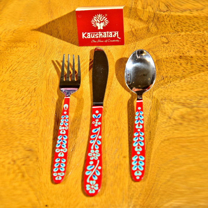 Ignite your dining experience with the vibrant energy of the Hand-Painted Cutlery Set in Red. This premium three-piece set—featuring a dinner spoon, knife, and fork—is meticulously crafted from high-quality stainless steel and finished with bold, hand-painted handles. The "Radiant Red" motifs are inspired by traditional artisanal patterns, offering a striking contrast against the polished metallic finish. Each piece is coated with a food-safe, durable sealant to ensure the artwork remains as vivid as your meals. Perfect for festive gatherings or adding a passionate pop of color to your everyday table setting, this set combines high-end craftsmanship with rugged, long-lasting utility.