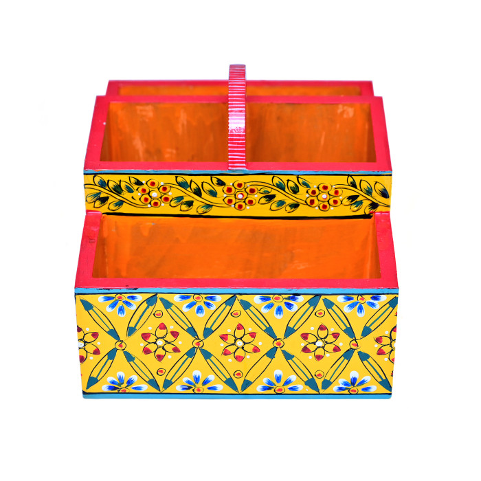 Brighten your kitchen counter and organize your dining essentials with the Hand-Painted Cutlery Stand in Sunny Yellow. This vibrant organizer features a cheerful citrus-yellow base, intricately hand-painted with white and earthy-toned floral or bohemian patterns. Designed with multiple sections to keep your spoons, forks, and knives perfectly categorized and within reach, this stand is as practical as it is beautiful. Crafted from high-quality, durable materials and finished with a protective glaze, it adds a burst of sunshine to your table setting. Whether you’re hosting a brunch or just tidying up your daily space, this "Lemon Zest" inspired holder is a functional piece of art that radiates positivity.