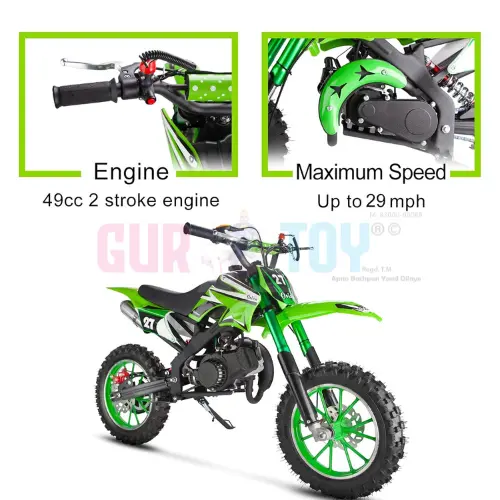 The bike is powered by a high-torque 49cc 2-stroke petrol engine, offering strong acceleration and a realistic riding feel. Designed for longer play sessions, the petrol engine provides consistent power without the downtime of charging. Its off-road knobby tyres, solid steel frame, and sporty racing look make it suitable for dirt tracks, open grounds, and backyard riding.