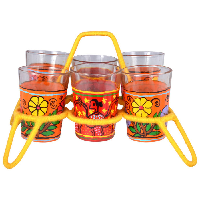 Bring the warmth of a traditional Indian tea stall to your home with the "Surya-Kiran" (Sunbeam) Tea Glass Set. This vibrant collection features six classic "cutting chai" glasses, hand-painted in a zesty, translucent Orange hue that glows beautifully when filled with hot tea. Each glass is adorned with delicate white or gold ethnic motifs, adding a touch of artisanal charm to the rustic experience. The set comes complete with a sturdy, hand-painted metal carrier/holder, designed with a rustic-chic finish for easy serving. Whether it’s a rainy afternoon or a morning gathering, this set turns a simple tea break into a celebratory "Chai Pe Charcha" moment.