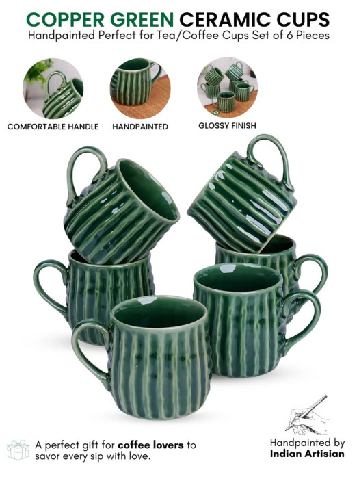 Any time can be tea time and coffee lovers would agree just the same. A favorite mug often becomes part of our everyday rhythm, from quiet mornings to friendly conversations. Inspired by these comforting rituals, VarEesha presents this Copper Green Handcrafted Ceramic Mug Set, designed to bring warmth, depth, and artisanal beauty to your table.