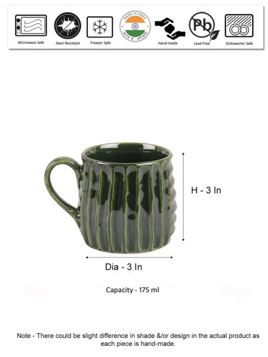 Each mug is individually hand-painted by skilled rural artisans, featuring a soothing green shaded finish created using hand-mixed colors and high-temperature glazing. The natural variations in tone and texture make every piece unique, adding authenticity and character to your collection.
