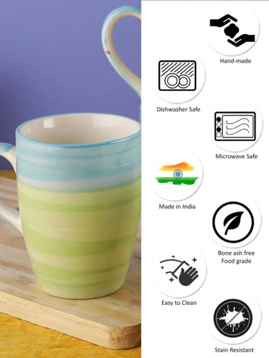 Inspired by the serenity of green landscapes and clear blue skies, the Bliss Blue Green Ceramic Large Coffee Mugs set of 4 brings a refreshing, cheerful touch to your dining experience. Each mug blends soothing green and blue shades, handcrafted to create a visually appealing and unique design that enhances your home decor.