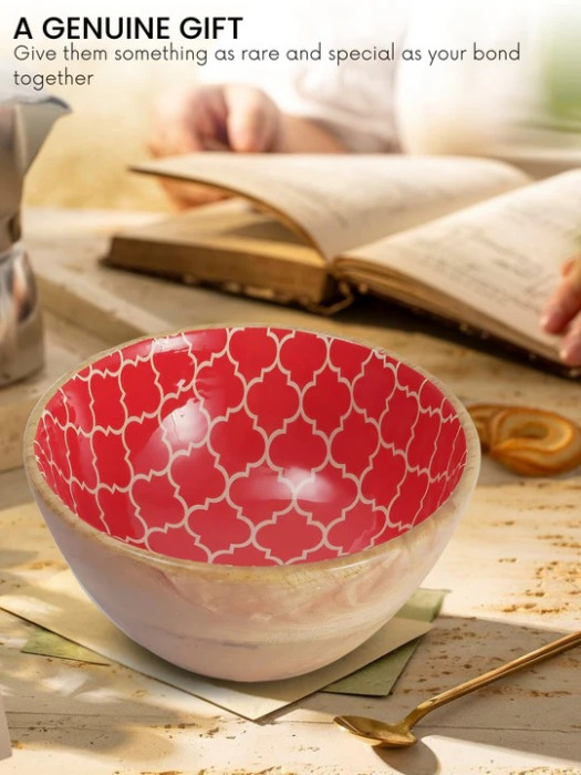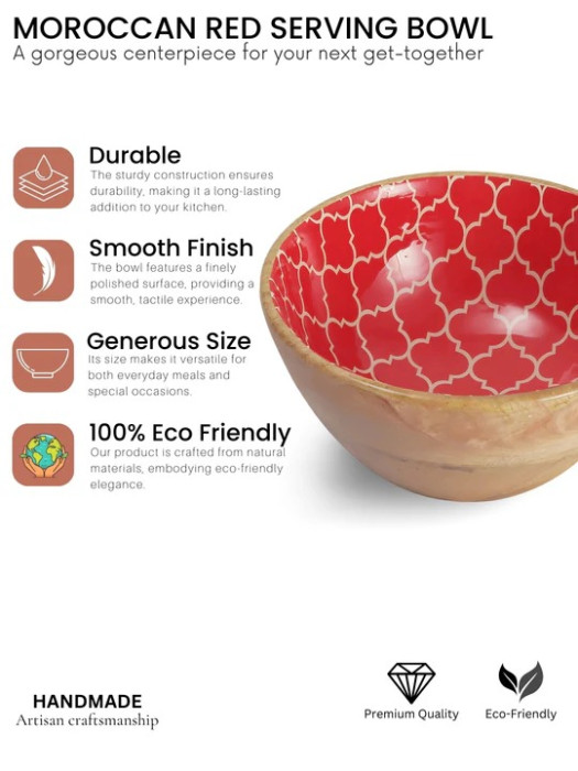 Infuse your dining space with a touch of artisan elegance with the Moorish Red Mango Wood Serving Bowl 7 Inch from VarEesha’s curated collection. Inspired by traditional North African motifs, this hand-finished bowl brings a vibrant, cultural aesthetic to everyday dining. The striking red hue and subtle patterned accents make it a standout piece, perfect for both functional use and decorative display.