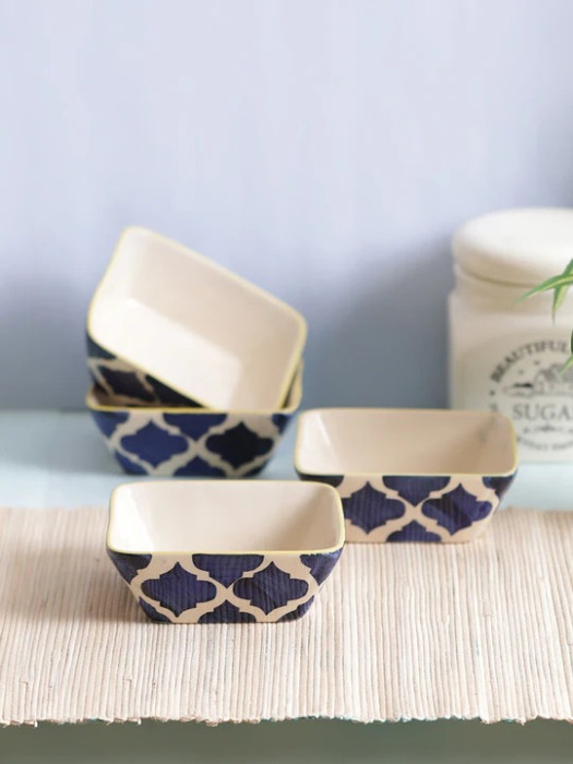 Perfectly sized at 5x5x2 inches (12.5x12.5x5 cm) with a 250 ml capacity, this set is ideal for serving gravies, side dishes, dips, or dry snacks. The square shape adds a contemporary flair, making these bowls suitable for both casual meals and festive occasions. Each piece is hand-crafted to ensure uniqueness and attention to detail.