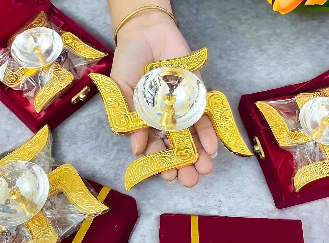 • Includes a traditional diya mounted on a Swastik design base