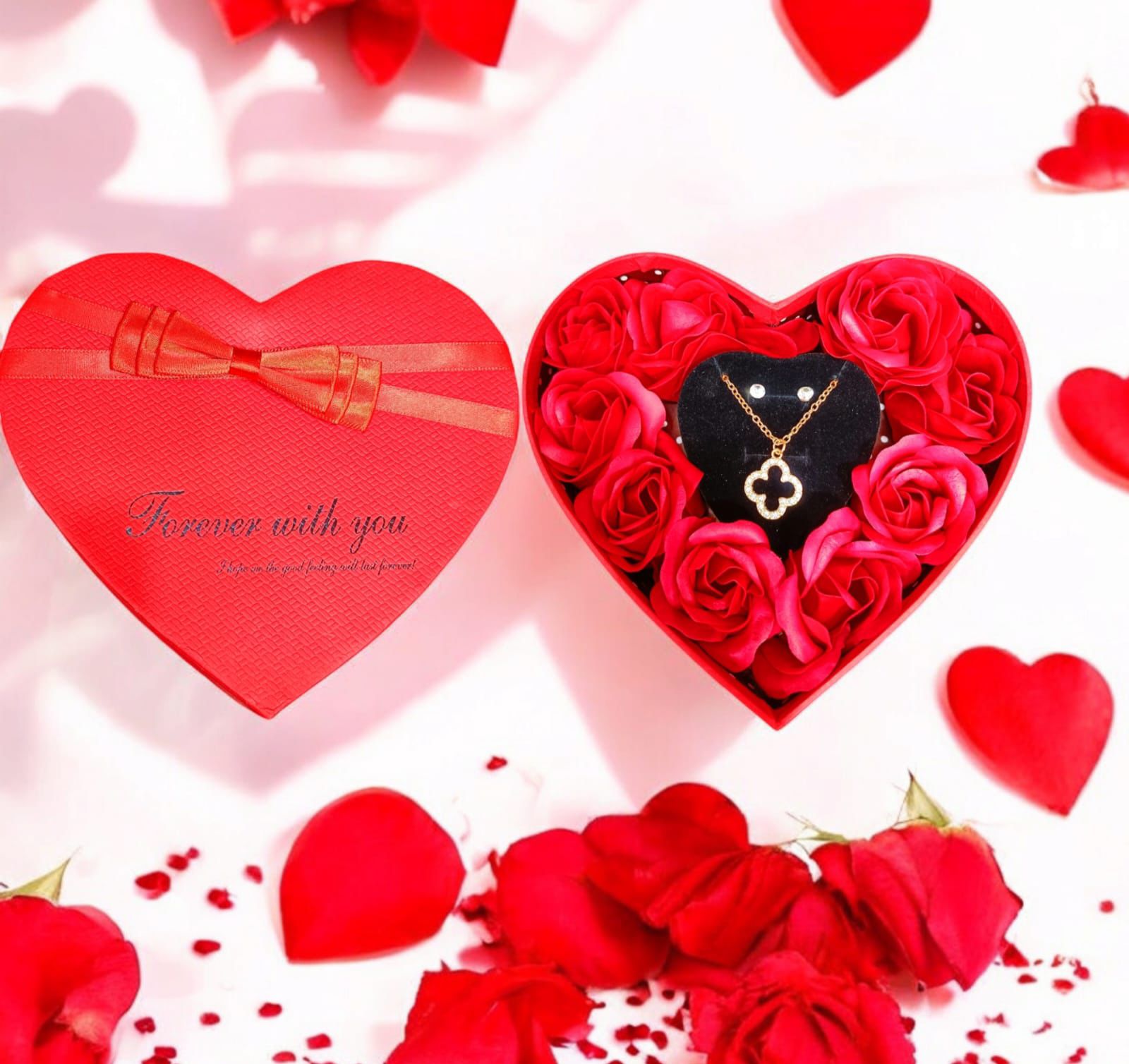 Looking for the perfect gift to melt their heart? This stunning Necklace with Earrings Gift Set comes beautifully packed in a romantic heart-shaped box, complete with gorgeous artificial flowers for an unforgettable presentation. It’s an all-in-one gift that combines timeless jewelry with the charm of floral beauty—perfect for any special occasion.