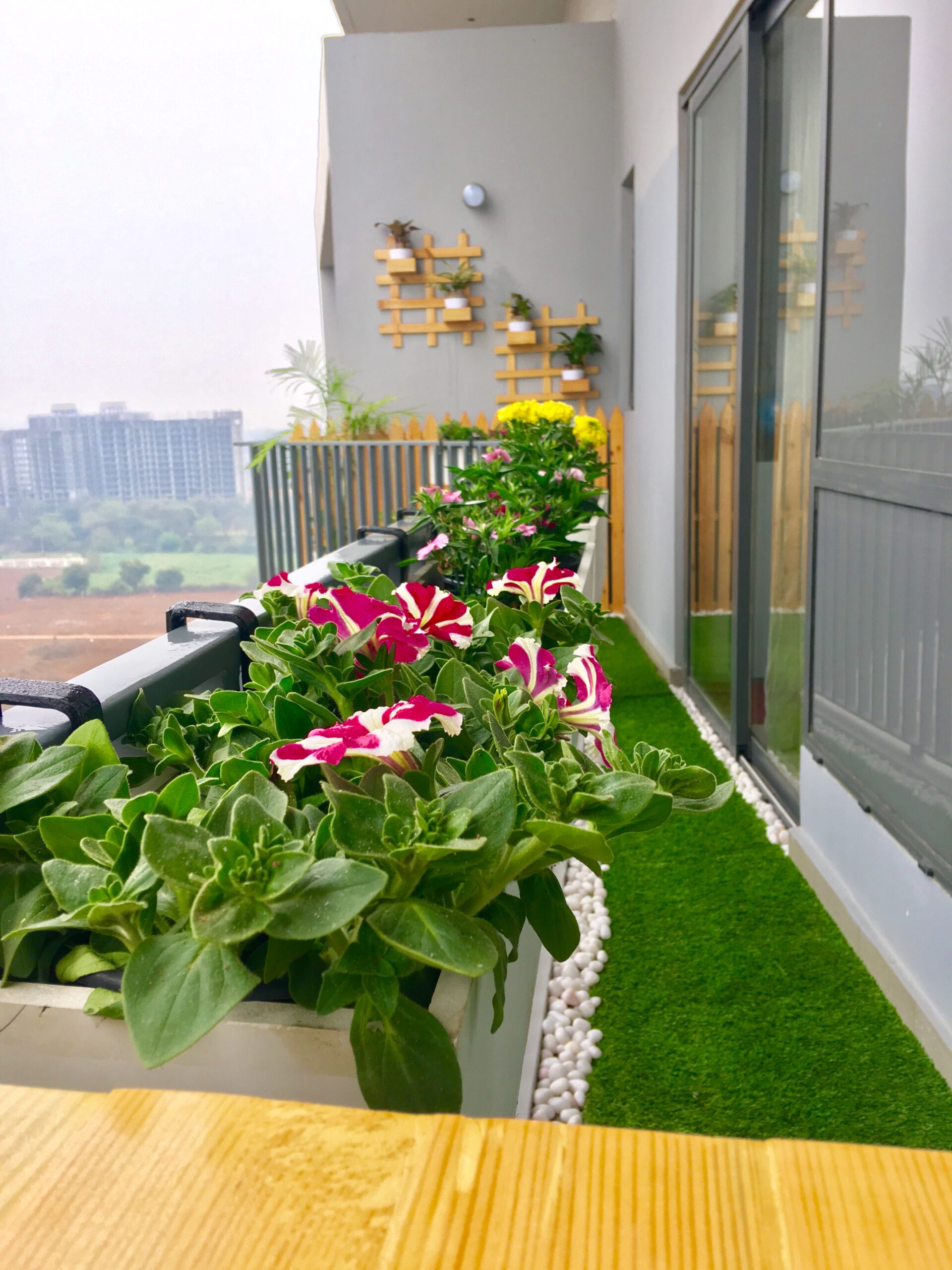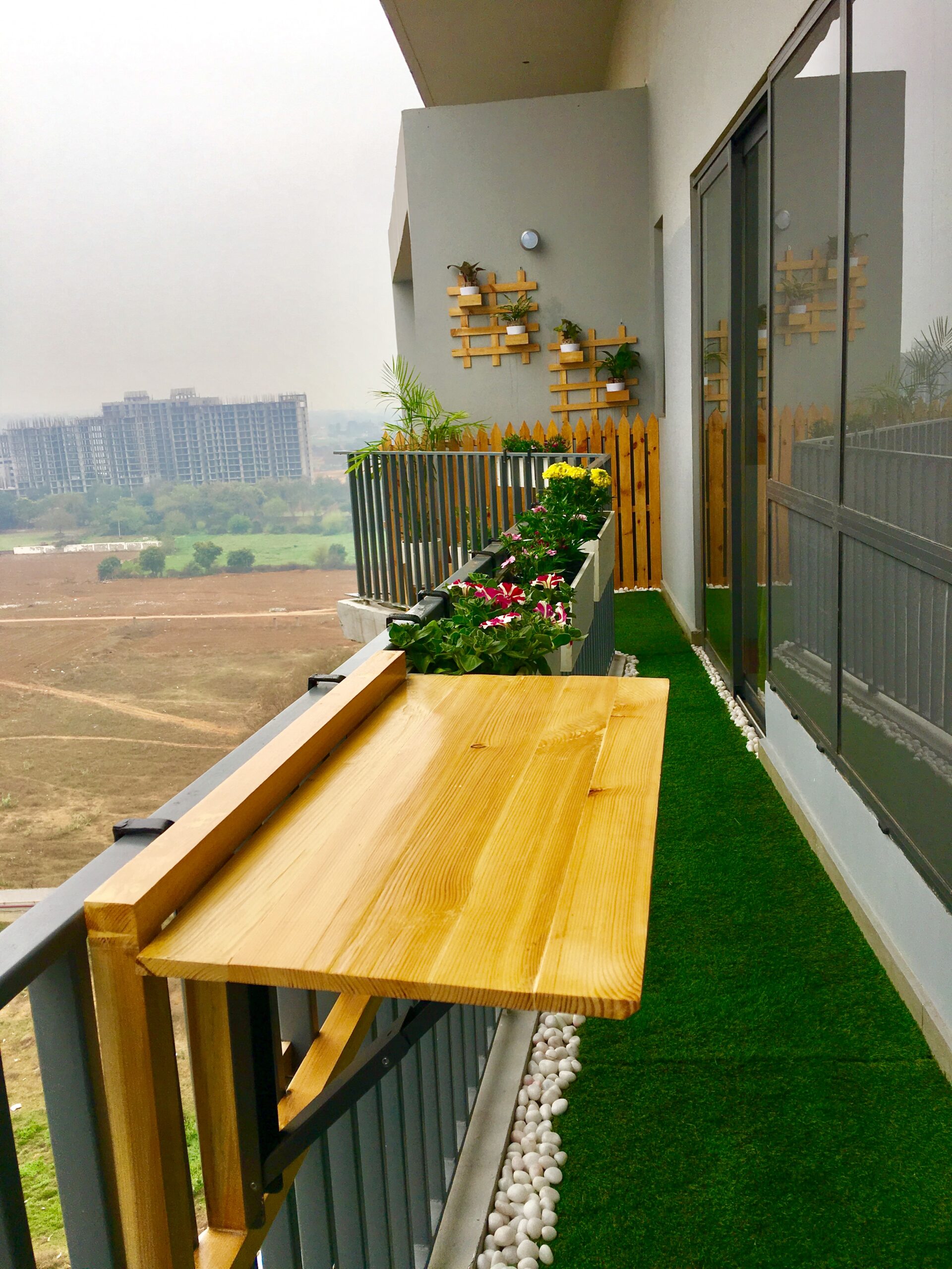 Wooden wall mount with fencing, railing planters, foldable railing table, artificial green turf with pebbles and wooden furniture.