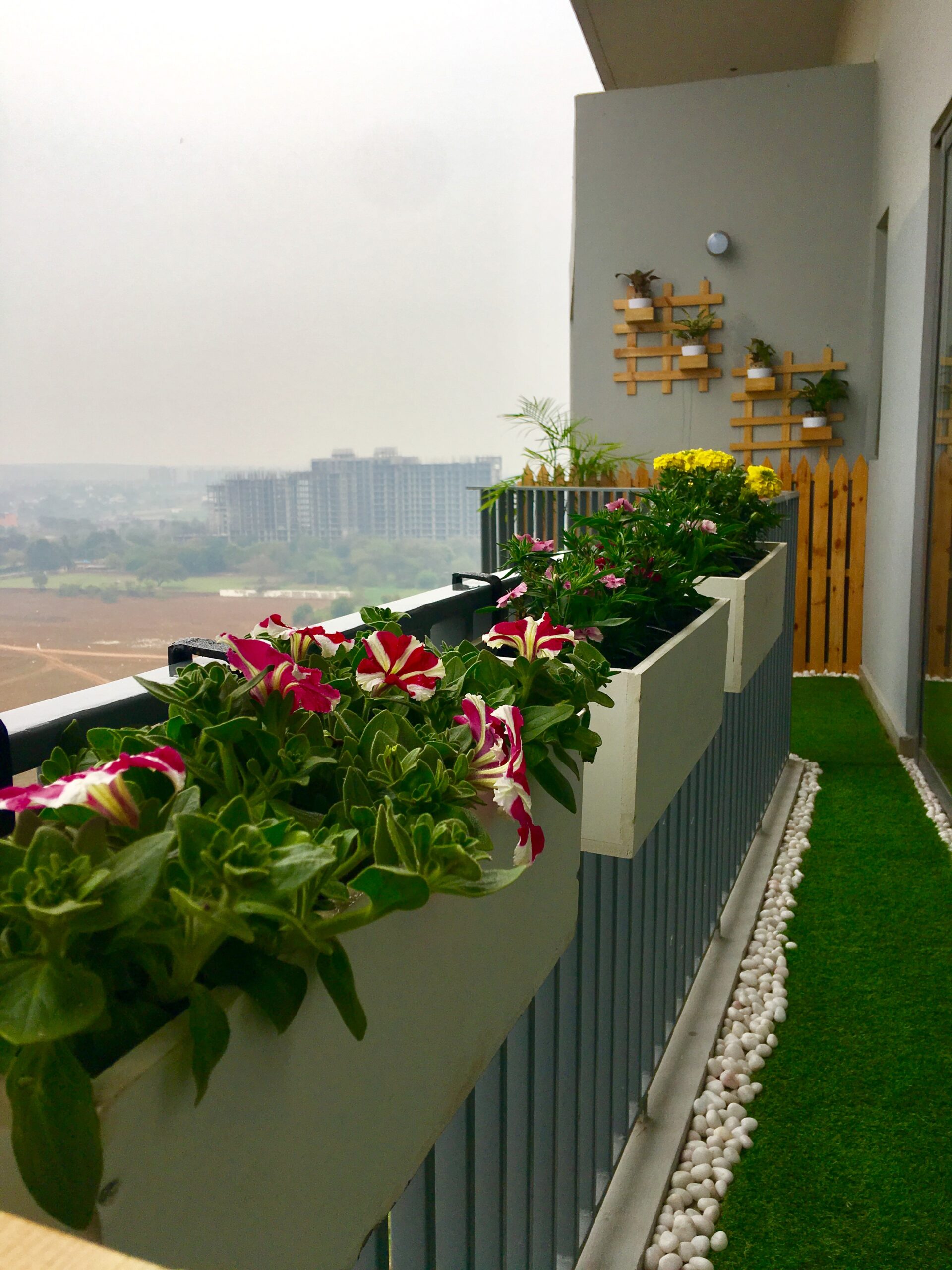 Modern balcony with wall mounted planters and wooden fencing